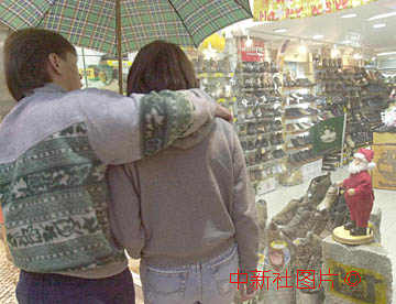 澳门一家商店特意让圣诞老人玩具手握特区区旗欢迎回归,引起一对情侣的好奇。