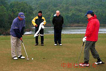 葡萄牙总统沈拜奥(右一)、澳门总督韦奇立(右二)与澳门特别行政区首任行政长官何厚铧冒雨在澳门高尔夫球俱乐部切磋球艺。中新社传真 毛建军摄
