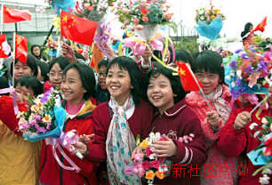 澳门儿童挥舞五星红旗和花束,热烈欢迎江泽民主席和朱镕基总理飞抵澳门出席政权交接仪式。中新社传真 李刚摄