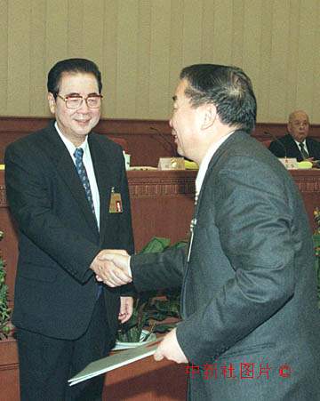 李鹏委员长二十日下午向全国人民代表大会常务委员会澳门特别行政区基本法委员会组成人员乔晓阳等十人颁发任命书。图为乔晓阳主任接受任命书。作者:任海霞