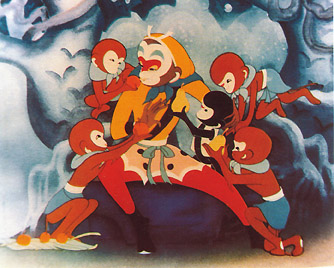 在花果山带领群猴操练武艺的猴王因无称心的武器,便去东海龙宫借宝。龙王许诺,如果猴王能拿动龙宫的定海神针--如意金箍棒,就奉送给他。但当猴王拔走宝物之后,龙王又反悔,并去天宫告状。玉帝采纳了太白金星的主张,诱骗猴王上天,封他为弼马温,将他软禁起来。猴王知道受骗后,一怒之下,返回花果山,竖起"齐天大圣"的旗帜,与天宫分庭抗礼。玉帝发怒,命李天王率天兵天将捉拿猴王,结果被猴王打得大败而归。玉帝又接受金星的献策,假意封猴王为"齐天大圣",命他在天宫掌管蟠桃园。一日,猴王得知王母娘娘设蟠桃宴,请了各路神仙,唯独没有请他。猴王火冒三丈,大闹瑶池,打得杯盘狼藉,他独自开怀痛饮,又吃了太上老君的九转金丹,收罗了所有酒菜瓜果,回花果山与众猴摆开了神仙酒会。玉帝暴怒,倾天宫之兵将,捉拿猴王。交战中猴王中了太上老君的暗算,不幸被擒。老君将他送进炼丹炉,结果不但没有烧死,反使猴王更加神力无比。于是猴王奋起反击,把天宫打得落花流水,吓得玉帝狼狈逃跑。