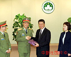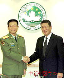 解放军驻澳门部队负责人拜会澳门特区行政长官(图文) 2000年1月25日 06:51 ![]() 解放军驻澳门部队司令员刘粤军二十四日在澳门特别行政区政府总部,拜访澳门特别行政区行政长官何厚铧,并就即将到来的中国农历新年,向何厚铧表示问候。中新社传真 毛建军 摄 解放军驻澳门部队司令员刘粤军(左二)、政委贺贤书(左一),二十四日在澳门特别行政区政府总部拜访特别行政区行政长官何厚铧,双方会面后互赠礼品。中新社传真 毛建军 摄