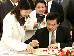 十月三日晚,在为中国奥运代表团举行的欢迎宴会上,著名乒乓球运动员王楠请国家副主席胡锦涛在一只巨型乒乓球球拍上签名。中新社记者毛建军摄