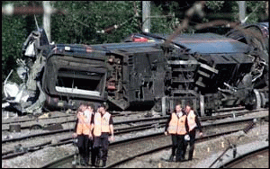 图文:伦敦发生火车出轨事故最少6人死亡 2000年10月18日 07:35 火车出轨失事,损毁异常严重。目前仍可能有多人被困车厢。 中新网伦敦10月17日消息:英国伦敦北部发生严重的火车出轨意外,最少造成6人死亡,80人受伤。目前仍有多人被困于车厢中,预料死亡人数还会增加。 据警方发言人表示,北京时间晚上7时左右,一辆由伦敦驶往利兹的火车以时速每小时115英里,行经离伦敦以北30公里的哈特菲尔德时突然脱轨,最少造成6人死亡,80人受伤,其中最少19人受重伤。伤者全部送往附近的医院救治。 据一名正乘搭该辆火车的电视台记者表示,火车撞毁的程度非常严重,3至4个车厢被撞得破烂不堪,其中餐车车厢的车顶被撕裂。第一个车厢的损毁情况最为严重。他并说,有乘客指车厢里有尸体;而铁路职员则指有6名员工下落不明。 救援人员及8部消防车于事发后赶到现场进行抢救。消防部发言人形容是一次极为严重的事故。消防员仍在车厢寻找被困乘客。直升机和救护车不断穿梭现场,协助救援。警方还设立了电话热线,协助伤者家属咨询。 高速火车所属的大西北铁路公司发言人表示,火车并非因与迎面火车相撞而失事,路轨也没有任何的障碍物,目前不清楚失事原因。 英国铁路曾发生多次出轨意外。最严重的一次发生于去年10月,当时一辆列车在行经伦敦西部时冲红灯,与迎面而来的高速火车迎头相撞,造成31人死亡。而97年也曾发生同类型意外,导致7人丧生。 |