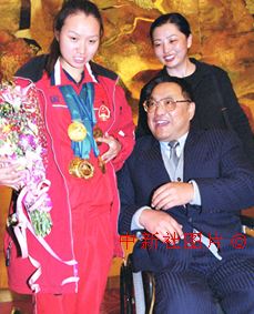 邓朴方祝贺在残奥会上获得五枚金牌的运动员朱宏艳 2000年11月2日 09:48 ![]() 在悉尼第十一届残奥会上取得历史性突破的中国残奥代表团31日回到祖国,11月1日中国残疾人联合会主席邓朴方在北京人民大会堂接见并祝贺代表团员。中新社记者 邹宪 摄
