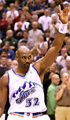 图文:NBA马龙打破张伯伦的得分纪录 2000年12月6日 13:33 ![]() 中新网北京12月6日消息:在北京时间12月6日上午进行的2000-2001赛季NBA常规赛尤他爵士队在主场迎战多伦多猛龙队的一场比赛中,由于爵士队前锋、“邮差”卡尔·马龙在离第二节比赛结束还剩4分58秒时在队友斯托克顿的助攻下投篮得手得到2分,从而使自己在本场比赛中的得分达到8分,也使自己职业生涯的总得分达到了31,420分,超过了排名第二的NBA巨星张伯伦的31,419分的总得分,成为NBA历史上得分第二高的球员。 目前NBA职业生涯总得分的最高纪录是由“天钩”贾巴尔保持的,为38,387分。 马龙1963年7月24日出生,身高6英尺9,体重256磅,1985年开始其NBA职业生涯。本赛季是马龙代表爵士队参加的第16个赛季,他共出场16场,平均每场上场时间38.4分钟,得23.2分,抢10.1个篮板球。在马龙16年的NBA生涯中,他仅缺席了7场比赛——3场因伤,4场被停赛。 马龙曾12次当选NBA全明星球员,两次当选最有价值球员。他也是唯一一位12次在一个赛季内得分超过2000分的球员,在罚球(8100个)和防守篮板球(9486个)两项上均名列NBA第二位。 相关报道:NBA上周最佳阵容 相关报道:NBA今日焦点之战:湖人碰撞76人 相关报道:NBA:最佳球员评选布莱恩特与马龙分庭抗礼 相关报道:图文:马龙当选NBA新赛季首月最佳 相关报道:图文:金块前锋麦克代斯被评为NBA上周最佳 |