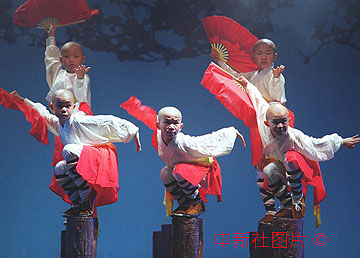 河南嵩山少林寺武僧团,26日在北京民族宫演出大型武术节目《少林雄风》,少年武僧们在梅花桩上表演铁扇功。中新社记者:满会乔 摄