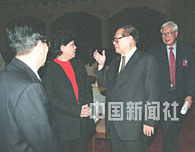 国家主席江泽民四日在北京出席政协教育、卫生界联组会时,与列席会议的教育部长陈至立谈论教育问题,强调要加快教育事业发展。中新社记者 满会乔 摄