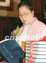梁思成夫人林洙女士二十日在北京人民大会堂举行的“梁思成先生诞辰一百周年纪念会”上,阅读梁思成先生全集。梁思成先生生前以参与设计中华人民共和国国徽图案及人民英雄纪念碑建筑图案而闻名。中新社记者 张勤 摄