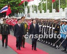中国总理朱镕基今天抵达曼谷,开始对泰国进行正式访问。泰国总理他信在总理府为朱镕基的 到访举行隆重欢迎仪式。中新社记者 谭宏伟 摄