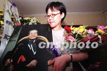 老舍夫人逝世 亲人家中追思 2001年5月23日 12:03 ![]() 国著名画家、老舍先生的夫人胡絜青二十一日下午四时二十七分因病在北京和平里医院逝世,终年九十六岁。图为胡絜青的大女儿舒济(右)与小舒雨(左)在家中深情地追思慈母的音容。 ![]() 中国著名画家、老舍先生的夫人胡絜青二十一日下午四时二十七分因病在北京和平里医院逝世,终年九十六岁。胡絜青的孙女舒悦专程从美国回来手捧祖母的照片深情的追思祖母的音容。