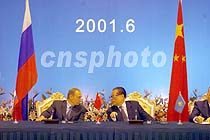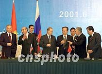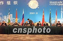 ![]() "上海合作组织"成立宣言签字仪式十五日在上海香格里拉饭店举行,中国国家主席江泽民、俄罗斯总统普京、哈萨克斯坦总统纳扎尔巴耶夫、吉尔吉斯斯坦总统阿卡耶夫、塔吉克斯坦总统拉赫莫诺夫及乌兹别克斯坦总统卡里莫夫出席了签字仪式。中新社记者 毛建军 摄