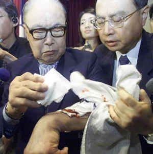 图文:连战探视割腕要求开除李登辉的夏功权 2001年07月31日 18:01 ![]() 为要求严格执行党纪,开除李登辉,夏功权(左)今天在国民党中评会上,激动地拿出小刀割左腕,血溅会场。(劲报/图) 中新网香港7月31日消息:台北讯,国民党主席连战今天中午参加完中央评议委员会议之后,即赶往台大医院,探视在会场上割腕“血谏”的中评委夏功权,对他爱党爱国的精神表示钦佩,但希望他能为党为国保重身体。 据“中央社”报道,国民党第十六届中央评议委员第一次会议发生中评委夏功权割腕血谏,要求开除前党主席李登辉的流血事件。夏功权随后被送往台大医院急救,连战也赶往探视,并致电慰问夏功权家属。 国民党文化传播委员会发言人周守训说,连战在国民党秘书长林丰正陪同下,于中午十二时三十分到台大医院探视夏功权,当时中评会主席团主席李焕也正在医院探视夏功权。 台大医院急诊室医师表示,夏功权的受伤部位已包扎好,只要略作休息就可回家休养。国民党行政管理委员会主委张哲琛目前还在医院照护夏功权,并将护送夏功权回家疗养。 夏功权小档案 曾经是台湾当局北美事务协调会首任代表的夏功权,今天在中国国民党中央评议委员会上,以激烈的手段割腕,血溅发言台,要求党主席连战以大义灭亲态度处理前主席李登辉的问题,让许多人对于这位外表温文儒雅的资深外交官举动,感到有些意外。 夏功权,上海人,一九一九年九月十七日生,中央军校、美国乔治城大学毕业,曾任蒋介石待从官、驻美武官、“外交部”礼宾司司长、驻纽西兰“大使”、驻纽约总领事、“中华民国”首任驻北美事务协调会代表、驻乌拉圭“大使”,中国国民党中评委。 相关报道:国民党元老割腕溅血强烈要求开除李登辉 |