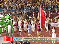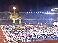 第二十一届世界大学生运动会在北京隆重开幕 2001年08月22日 20:09 ![]() 8名大学生志愿者高抬大运会会旗入场。 ![]() 中国代表团进入大运会主会场。 ![]() 在开幕式上随着奥运冠军田亮点燃飞碟形点火器,飞碟升空后落下,准确点燃了第21届世界大学生运动会主火炬,大运会开幕式的主火炬如何点燃的谜底终于揭开。