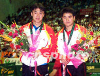 图:马琳/刘国正夺得九运乒乓球男双金牌 2001年10月20日 17:54 ![]() 在19日晚结束的九运会乒乓球男子双打决赛中,广东队的马琳/刘国正以三比二力克北京的高伟/刘恒勇夺金牌。图为马琳/刘国正在领奖台上。中新社图 王惠存 摄 |