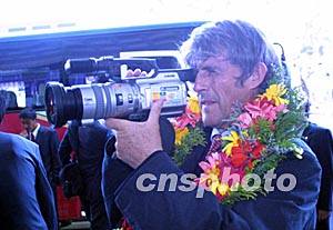 ![]() 二十六日下午,中国足球队到达西归浦时受到热烈的欢迎。头戴花环的米卢拍下了激动人心的欢迎场面。史利 摄