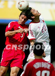 中国足球队(白衣)十三日在汉城世界杯体育场迎战土耳其队,结果土耳其以3:0战胜中国队。图为杨晨与对方争夺头球。作者:毛建军
