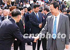 福建省委书记宋德福(右一)、省长习近平十日与出席闽省海外联谊会第三届理事大会的部分海内外理事、嘉宾亲切交谈。作者:刘可耕