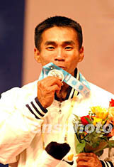 香港运动员李立志十月六日在釜山亚运会男子六十五公斤级健美比赛中夺得银牌。图为他亲吻亚运奖牌。作者:潘索菲