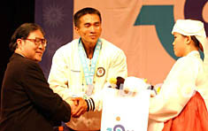 香港健美运动员李立志在十月六日举行的釜山亚运会健美比赛中夺银,图为中国香港奥委会主席霍震霆为李立志颁奖。作者:潘索菲