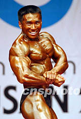 香港健美运动员李立志在十月六日举行的釜山亚运会男子健美六十五公斤级比赛中夺得银牌。作者:潘索菲