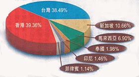 各地区上榜华商市值占华商500总市值比率示图(注:2002年国际华商500强总市值为4763亿美元)