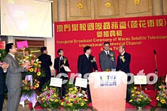 澳门莲花卫视"澳门卫视国际商务台"开播庆典二十八日在澳门中国大酒店举行,图为主理嘉宾在庆典现场主持开播仪式。中新社图 李刚 摄