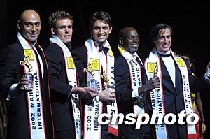 二OO二世界男模大赛总决赛十四日晚在沪落下帷幕。经过角逐,法国的FABRICE WATTEZ(中)获得冠军;来自比利时的BART DE SCHUYMER(左二)获得亚军。作者:汤彦俊