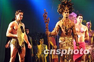 昂立多邦2002世界男模大赛总决赛十四日晚在上海大剧院举行。本次大赛来自世界各地的男模不仅向申城观众展示了当今世界顶级男模的风姿,而且还让观众领略到了浓郁的异国风情。图为男模们在展示带有浓郁民族风情的服饰。作者:汤彦俊