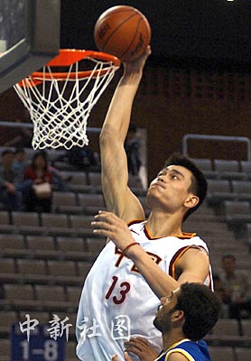 中国男篮二十八日在釜山金井体育馆进行的亚运首场比赛中,以78:45大胜科威特队。图为姚明大力扣篮。作者:武仲林