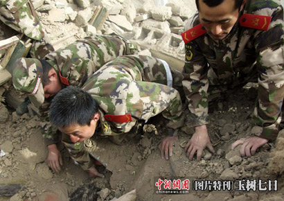 武警战士在玉树地震废墟里救助被困民众