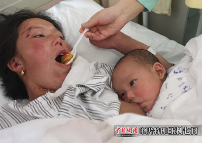 护士正在给伤员喂饭,怀中4个月大的孩子在吃奶