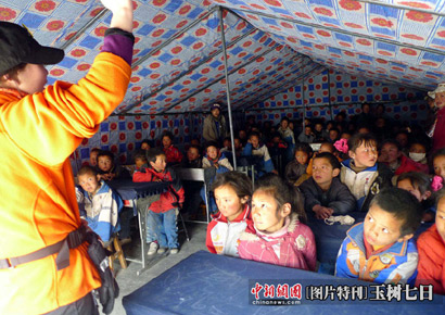 青海玉树县第三完全小学的帐篷学堂里学生们正在上课