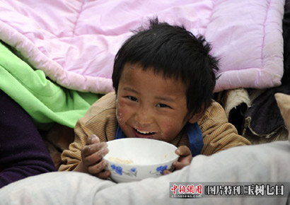 青海玉树体育场地震民众安置点一个孩子露出笑容