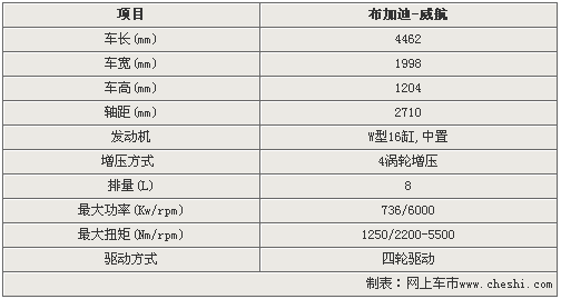 布加迪威龙(VEYRON)这个名字源自曾经驾驶布加迪57赢得1939利曼桂冠的Pierre Veyron。而16.4代表16个气缸和4个涡轮增压器。 这款车配备了大众专门研发的W型16缸发动机,可以说是将两台V8发动机公用一根曲轴的产物。此外,该发动机还配备了4个涡轮增压器。排量达到了7993cc。可以迸发出736千瓦的最大功率,同时在极低的1000rpm时即可输出730牛米的庞大扭矩,在2200rpm时就可以迸发出1250牛米的峰值扭矩,这种扭力会一直持续到5500rpm。