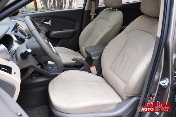 ix35配备了米色真皮材质座椅,座椅宽大舒适,并具有不错的包裹性,前排座椅拥有通风和电加热功能,驾驶席座椅为6向电动调节且配有腰部支撑功能,幅驾驶席为6向手动调节。