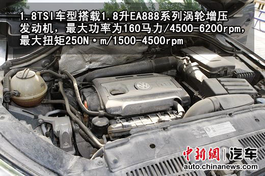 本次试驾的车型为1.8TSI顶配版,该车型搭载的1.8升EA888系列涡轮增压发动机我们并不陌生,在迈腾与昊锐上都能找到,最大功率为160马力/4500-6200rpm,最大扭矩250N•m/1500-4500rpm,与之匹配的是tiptronic 6速手自一体变速箱。