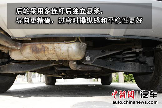 悬挂方面,途观使用带有S形偏心弹簧的麦弗逊前独立悬架,能自动调整前轮外倾角,令车轮在过弯时自适应路面,轮胎接地面积最大化,驾驶自然平顺而舒适。同时,底盘振动和噪声也相应降低。后轮采用多连杆后独立悬架,导向更精确,过弯时操纵感和平稳性更好。