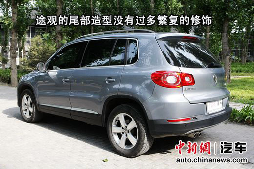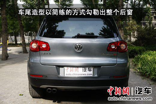 途观的尾部造型没有过多繁复的修饰,以简练的方式勾勒出整个后窗,凸显了宽大的车内空间。立体造型尾灯透出都市气息,圆润的线条与前灯遥相呼应。右下方TIGUAN TSI文字下面的4MOTION代表了其四驱的身份,镀铬的双炮筒排气管安装在车尾左侧,动感十足。