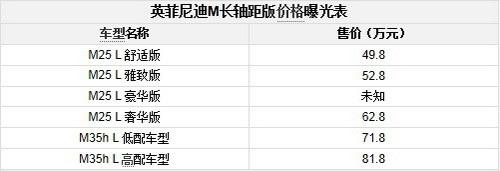 在2012北京国际车展上,英菲尼迪全球首发了全新一代长轴版M车型。新车轴距在现款轴距的基础上增加了150mm,达到了3050mm。据悉,这款车型将于6月8日在国内上市销售。