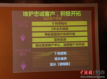 在网络拓展方面,陈国章表示,今年雷诺中国将在华建立30家授权卫星店,经销商网络会下沉至三、四线城市,计划在今年年底在华经销商网点拓展到115家。为了更好的服务好雷诺车主,雷诺还将推出“慧生活•优相随”大型主题活动,从2012年开始,推出购车优惠政策,零利率购车、赠送1年全年保险、导航地图首次免费升级等,随后还会推出购车免购置税、延长免费保养、延长“诺相随”服务等。