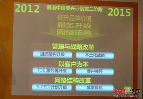 在复兴计划第一阶段,雷诺实现了在中国品牌认知度和销量高速增长,年销量从08年894辆增长到2011年的24275辆的成绩。2012年上半年,雷诺销量同比增长15%,超过行业平均水平,也使雷诺中国在全球地位得以提升,2012年初,雷诺中国正式脱离亚非区管理,直接向全球总公司汇报工作;雷诺总部成立中国业务部,由雷诺汽车公司执行副总裁中村克直接负责。而面对与以前不同的汽车市场环境,陈国章坦言称,国内车市变化让车企面临着新的挑战,而复兴计划第二阶段的开启,正是保证雷诺在未来几年增长的一大“法宝”。
