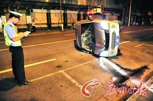 交警在处理因司机酒后驾车所造成的交通事故。