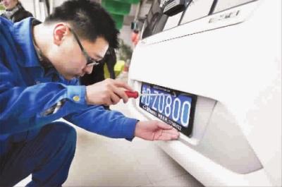 ■工作人员在首辆“绿牌”车的车尾安装车牌 记者 陈意俊摄