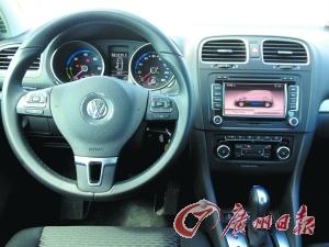 E-Golf内饰整体布局、乘坐空间与普通版也几无差别,走实用的路线,显然为这款车的日后普及做好了准备。中控台布局完全和普通版一样但功能有了变化。仪表盘的右侧依旧为车速表,左侧是电动机功率输出表,上面显示的数值为电动机的功率输出比例,水温表和油量表变为了续航里程表和电量表。彩色显示屏显示车辆信息,如能耗、续航里程、电量等,多媒体系统带有导航、蓝牙电话等功能。据说,E-Golf还装置了大众新的定位互动服务,这个功能与安吉星类似,不过未能体验到。