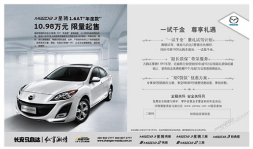 活动期间,不仅可以一试抵千金,享受多重优惠政策,还可以轻松购入马自达3星骋1.6L AT“年度款”,仅需10.98万元的震撼超低价。别以为降价是以减配为代价,该车款与星骋原有1.6L自动档车型在配置上毫无二致,性价比自然不言而喻。