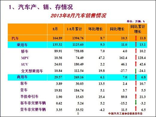 昨日,中国汽车工业协会行业发布最新汽车产销数据,2013年8月份,汽车产销总体依然保持了稳定增长,产销增幅虽较前7月趋缓,但总体依然保持两位数增长。销售方面,乘用车市场当月销量环比和同比均呈增长态势,其中中国品牌乘用车市场占有率较上月有所提升,日系品牌销量唯一下降,其它外国品牌各有增长,其中德系品牌增速居前。