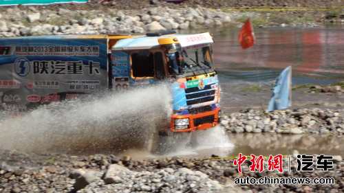 本站首次使用河道赛道,水深1.5米。由于前几日连续降雨,拒马河上水位上涨,尽管组委会竞赛组进行了及时的排水工作,但水深及水道长度仍略高于理想状态。所幸高水位超长水道并未影响赛车的正常发挥,赛手们驾驶的陕汽重卡配以潍柴WD12.420型号发动机、法士特8挡变速箱、汉德加强车桥、零公里公司提供的钢铁侠赛车专用润滑油和固铂成山专用轮胎等超强配置,在本次比赛中展现出卓越的动力性、优良的的涉水性能和操控稳定性,保证了比赛的正常进行。