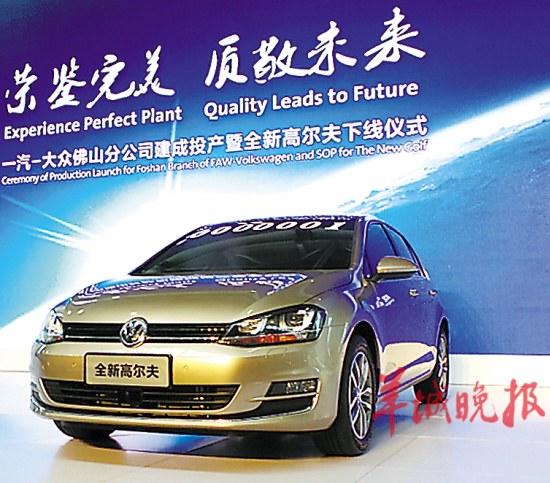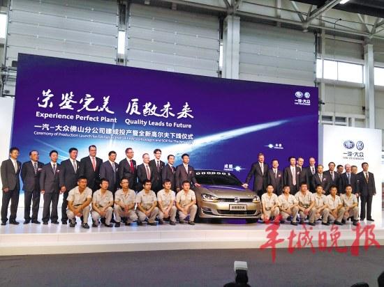今天上午10时,备受瞩目的一汽大众佛山分公司一期建成投产,同时首款车型高尔夫7也在佛山正式下线。记者了解到,佛山分公司首期年规划产能30万辆,到2015年总产能将达到60万辆以上,预计能为佛山带来超过千亿元的产值。据悉,佛山工厂的投产将极大缓解一汽大众的产能瓶颈。