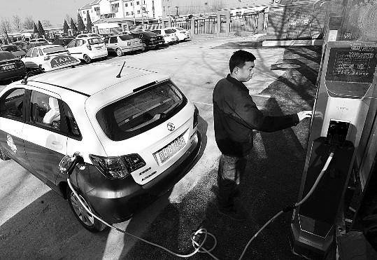 28日,位于北京地铁15号线俸伯站旁的北京市首个“P+R”(停车加换乘)充电场站正式发电投入运营,这也是北京开展公共区域停车场充电设施建设的首次尝试。图为当日工作人员为一辆电动出租车充电。公磊/摄